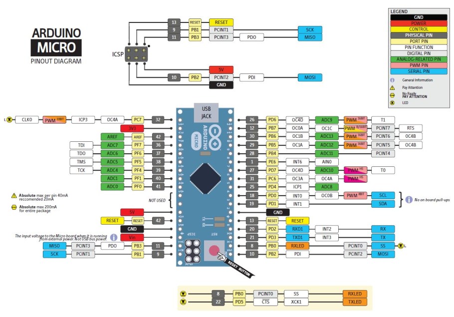 - Serial 0 (RX) ve 1 (TX) : Bu pinler TTL seri data almak (receive – RX) ve yaymak (transmit – TX) içindir. Micro üzerinde Serial sınıfı USB (CDC) haberleşmesi içindir. Pin 0 ve 1 üzerinden seri haberleşme için Serial1 sınıfı kullanılmalıdır.